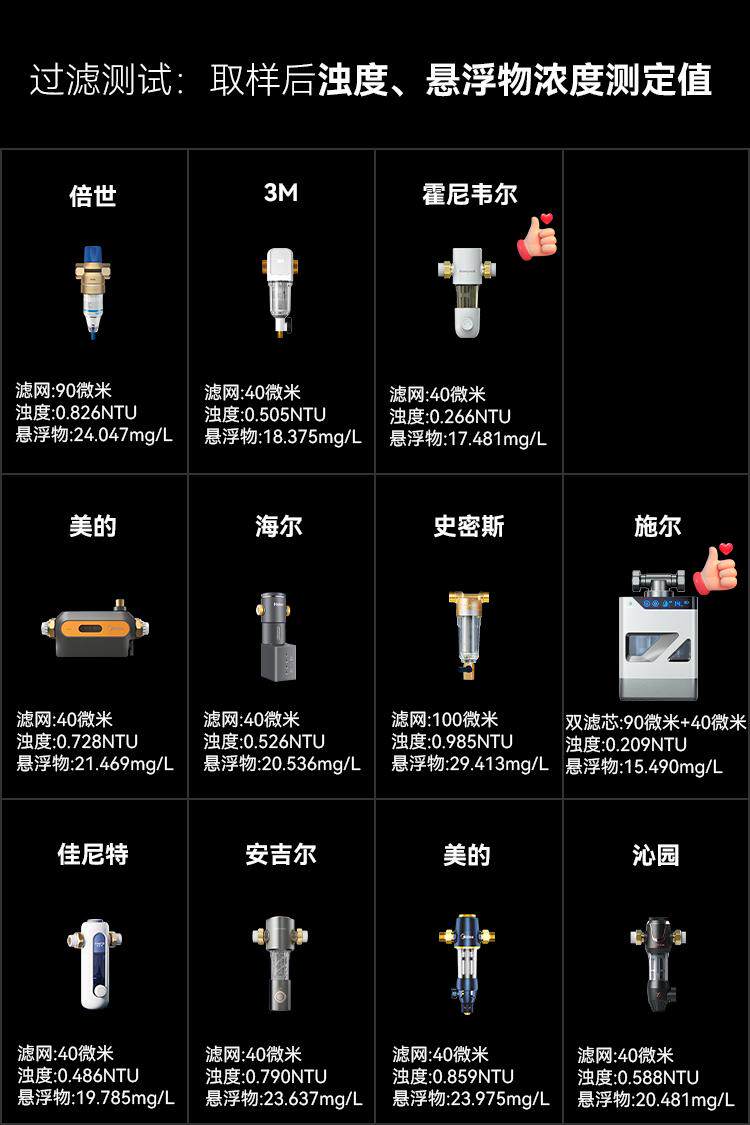 从冲洗结果来看:可以看出冲洗效率最好分别是施尔和海尔自动反冲洗,海尔是得益于滤网接触面积较少,而施尔是第四代双滤芯技术。其他表现较好的都是反冲洗叠加多冲洗附件,但代价是结构更复杂,增加了过滤压力,附件容易老化。