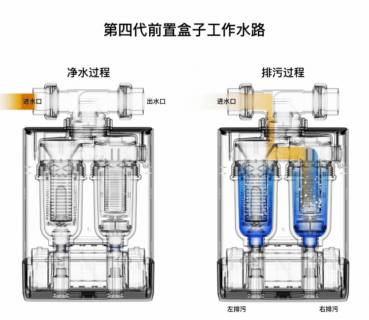 过滤器的单滤芯T字结构演变为双滤芯方盒子结构,原水从先经过右边低精度的滤芯进行第一次过滤,然后再经过左边高精度滤芯再进行第二次过滤,过滤的水更干净。相比传统单滤网产品,双滤芯分担过滤压力,减少了滤网藏污纳垢,清洁难度较第三代低一倍,能分别单独冲洗排污,所以管道更通畅,从而更耐用。