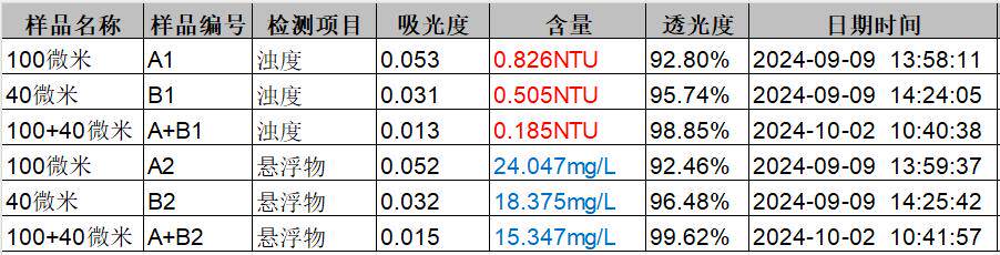 最后分别取样11款前置过滤后的水,用高精度的水质检测仪检测两个水质重要指标:浊度、悬浮物浓度。