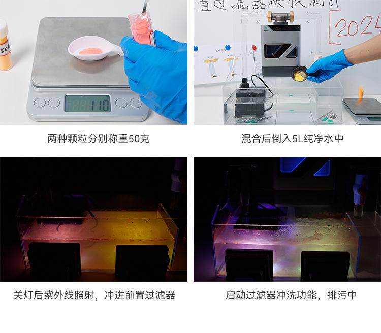 实验方式:用50克150目、50克250目的荧光颗粒加入5L纯净水中,模拟仿自来水中的大小颗粒杂质。(150目≈100微米,250目≈58微米)混合后全部冲进前置过滤器,然后启动冲洗功能,结束后进行拆卸,用紫外线灯照射滤网,观察荧光颗粒附着在滤网上的面积,对比冲洗效果。