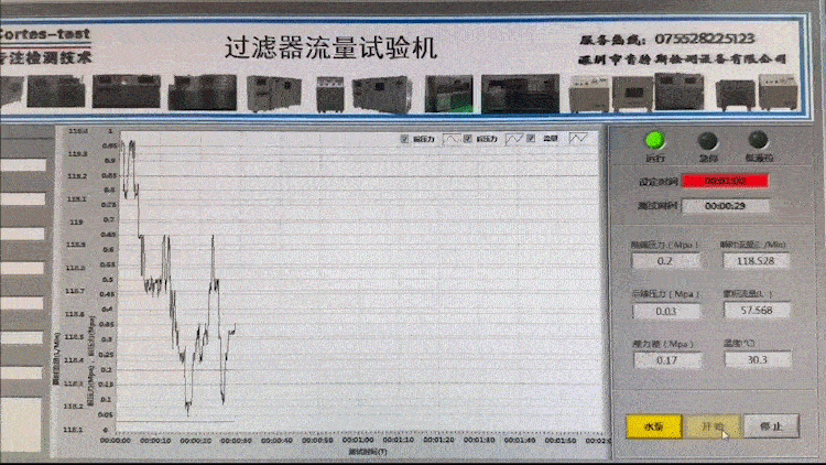 实验方式:测试前置过滤器在最大工作压力下是否能够正常工作,不发生破裂、泄漏或变形。一般来说,前置过滤器的耐压能力应该高于管道系统的工作压力。我们使用结构安全高压试验机,按照升压速度小于0.69 MPa/s进行,70s内达到要求压力48.3Mpa,持续5s后泄压。